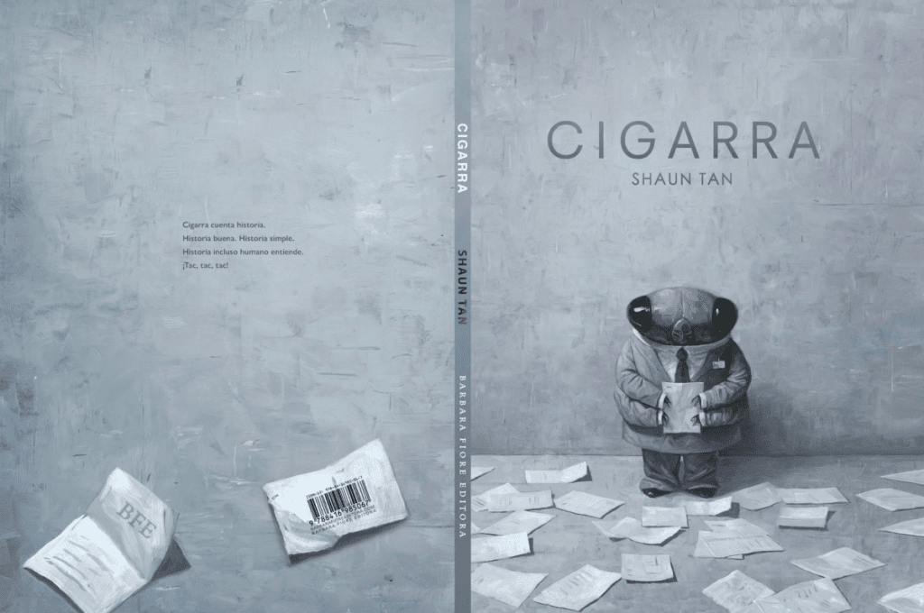 Aquest llibre, Cigarra de Shaun Tan, respon perfectament a aquesta situació. Primer, un autor amb una trajectòria magnífica al gènere i amb un ampli reconeixement per part de les crítiques i dels lectors. Només cal recordar que seu és l’àlbum Emigrantes, segurament un dels millors llibres per entendre el que significa aquest fenomen i vacuna de lectura deliciosa pels discursos d’odi contra el diferent cada cop més nombrosos. En segon lloc, una edició absolutament magnífica per part de l’editorial Barbara Fiore que s’ha demostrat com una de les cases amb un fons més potent i interessant pel que fa al llibre il·lustrat. Una edició molt cuidada, com totes les d’aquesta editorial granadina que ha recollit diversos premis en reconeixement d’aquesta tasca.