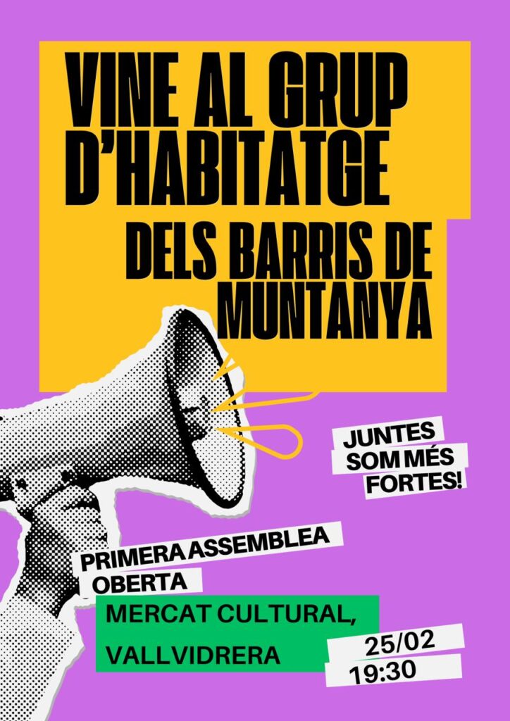 Davant d’aquesta situació, des del Grup d’Habitatge dels Barris de Muntanya ho tenim clar: l’habitatge és un dret, no un negoci. Apostem per l’organització i l’acció col·lectiva per fer front a la vulneració sistèmica i continuada del dret a un habitatge digne. Volem ser un espai de suport i acompanyament per a totes les que patim la dificultat d’accés a l’habitatge, així com un espai de denúncia i d’incidència política als Barris de Muntanya.